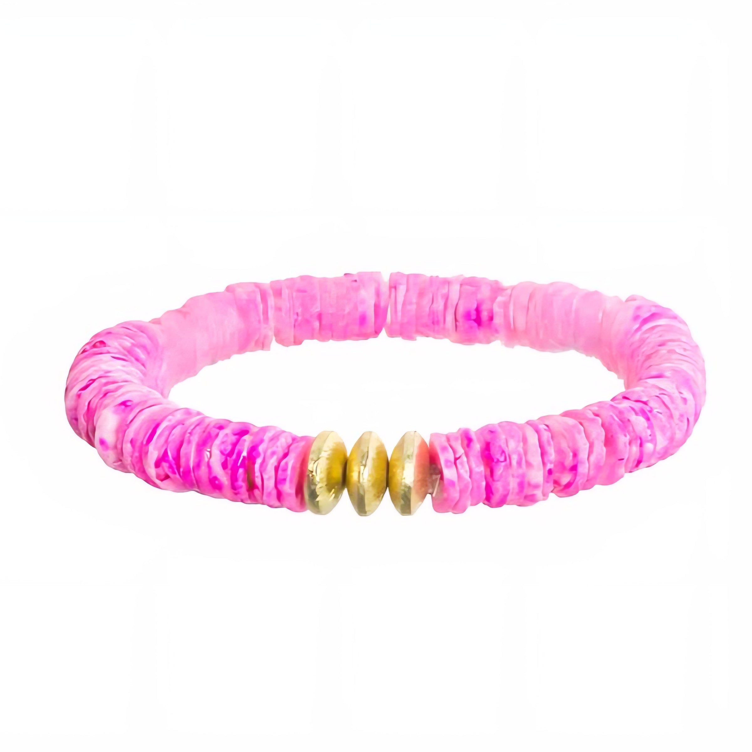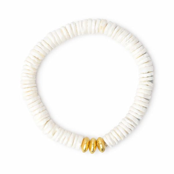 Add a pop of color to your everyday stack. This dainty shell bracelet is handcrafted using natural shells in bright cheerful hues and finished with brushed gold center beads, artisan made in India. Strung on a comfortable stretchy cord, it slips on easily and layers beautifully with your favorite bracelets.ย