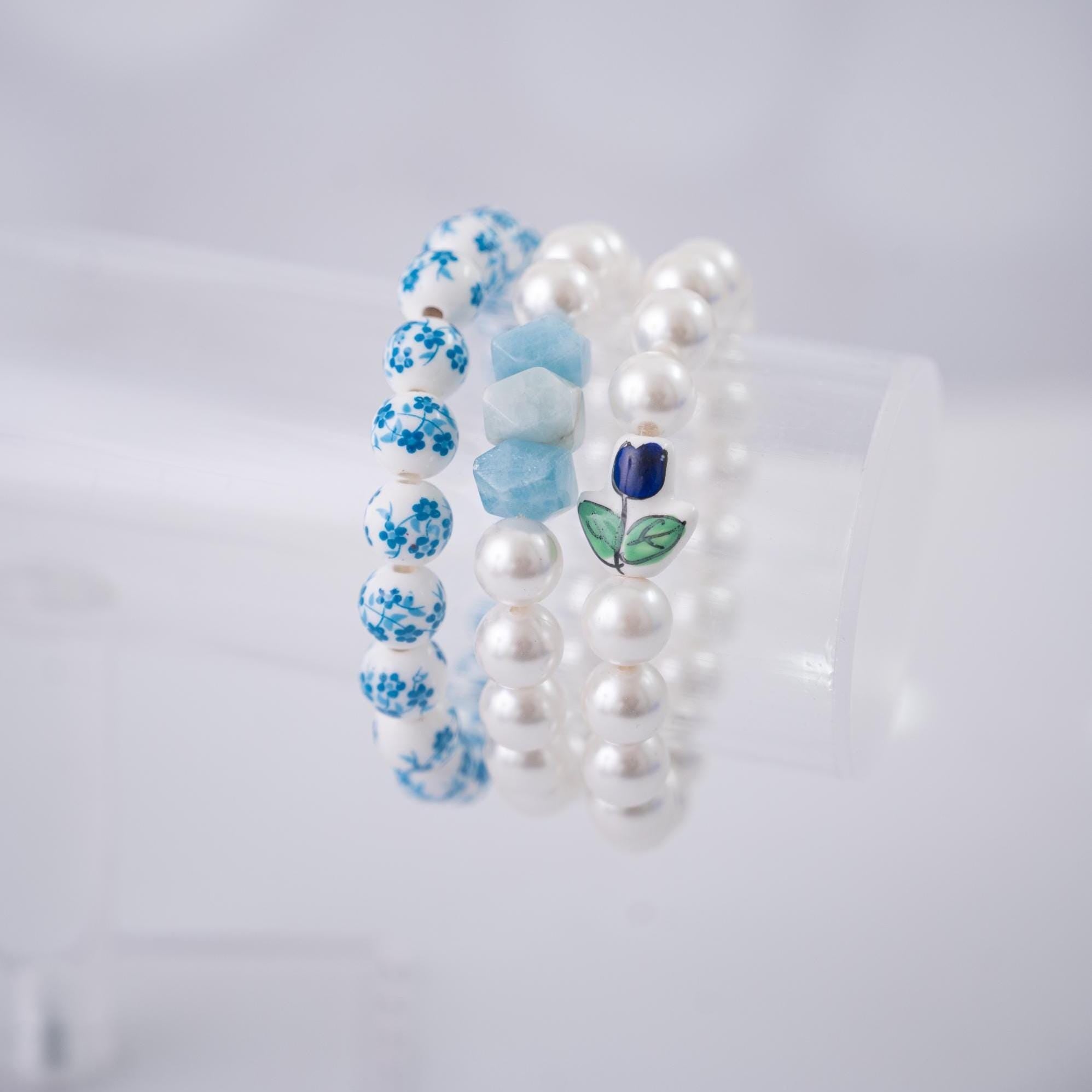 Introducing The Tulip Tea Time Stretchy Pearl Bracelet With Navy Blue FlowerDETAILS